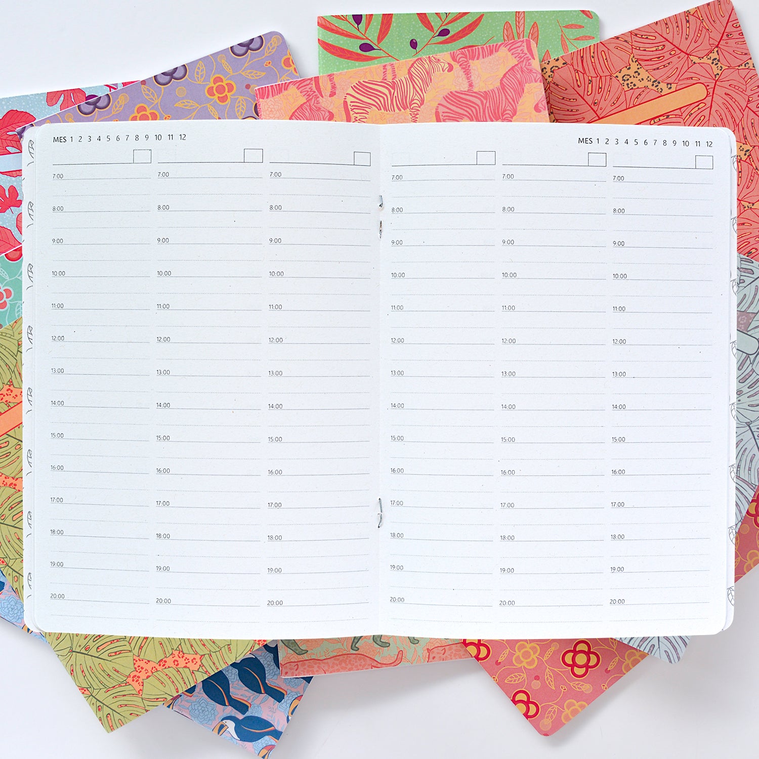 Planners A5 semanales con horarios, sin días ni fechas preestablecidas para máxima flexibilidad.