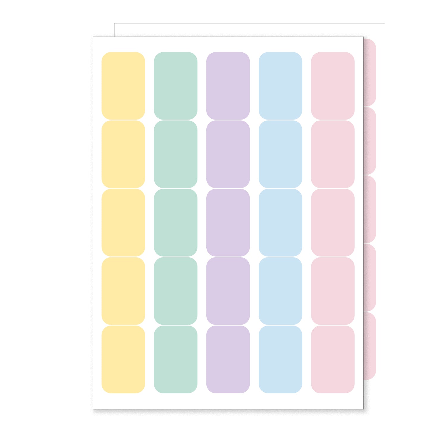 Contiene 2 hojas de pegatinas con 5 pegatinas en cada color: rosa, celeste, malva, verde y amarillo (10 pegatinas de cada color en total).
